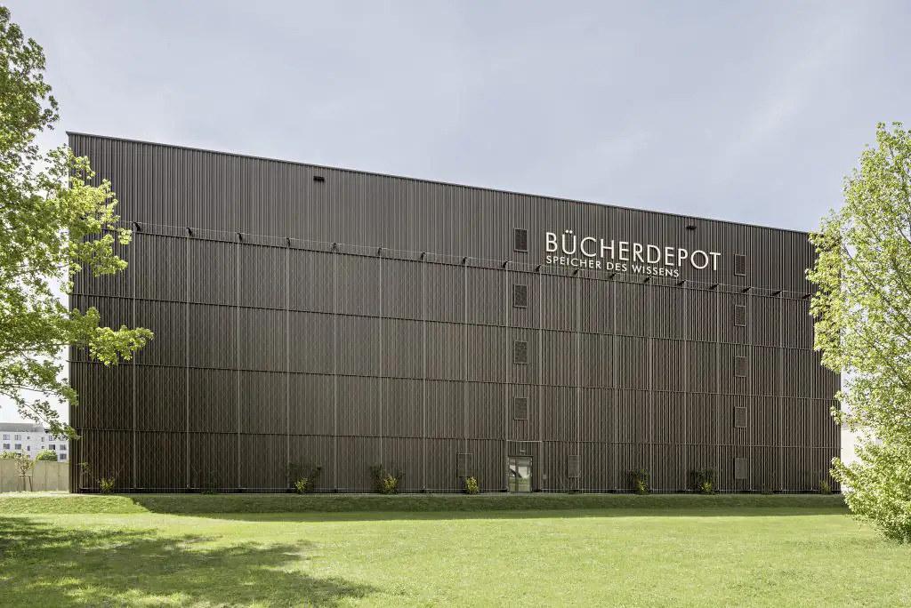 Angesichts der begrenzt verfügbaren Flächen im historistischen Gebäude am Ring war es das Ziel, die Bibliotheksbestände vom Benützungs- und Verwaltungsbereich zu trennen. Der neue „Speicher des Wissens“ der BIG mit Anlieferung- und Sortierstation sowie großzügigen Depotflächen musste zahlreichen Anforderungen gerecht werden: hohe Traglasten, beste konservatorische Bedingungen, komplexer Brandschutz sowie energiesparende Klimatechnik. Pittino & Ortner entwarfen einen kompakten Holzhybridbau, wobei das Stahlbetonskelett aus möglichst viel Recycling- Beton besteht. Die fast fensterlose Fassade Richtung S-Bahn soll zur vertikalen Grünfläche heranwachsen. Die Fachliteraturversorgung der Institutionen in der Innenstadt wird nunmehr durch einen Shuttleservice mit Elektrofahrzeug sichergestellt, der neben der Hauptuniversität auch die Technische Universität, die Universität für Angewandte Kunst, die Akademie der bildenden Künste und GeoSphere Austria beliefert, welche das Bücherdepot ebenfalls nutzen.