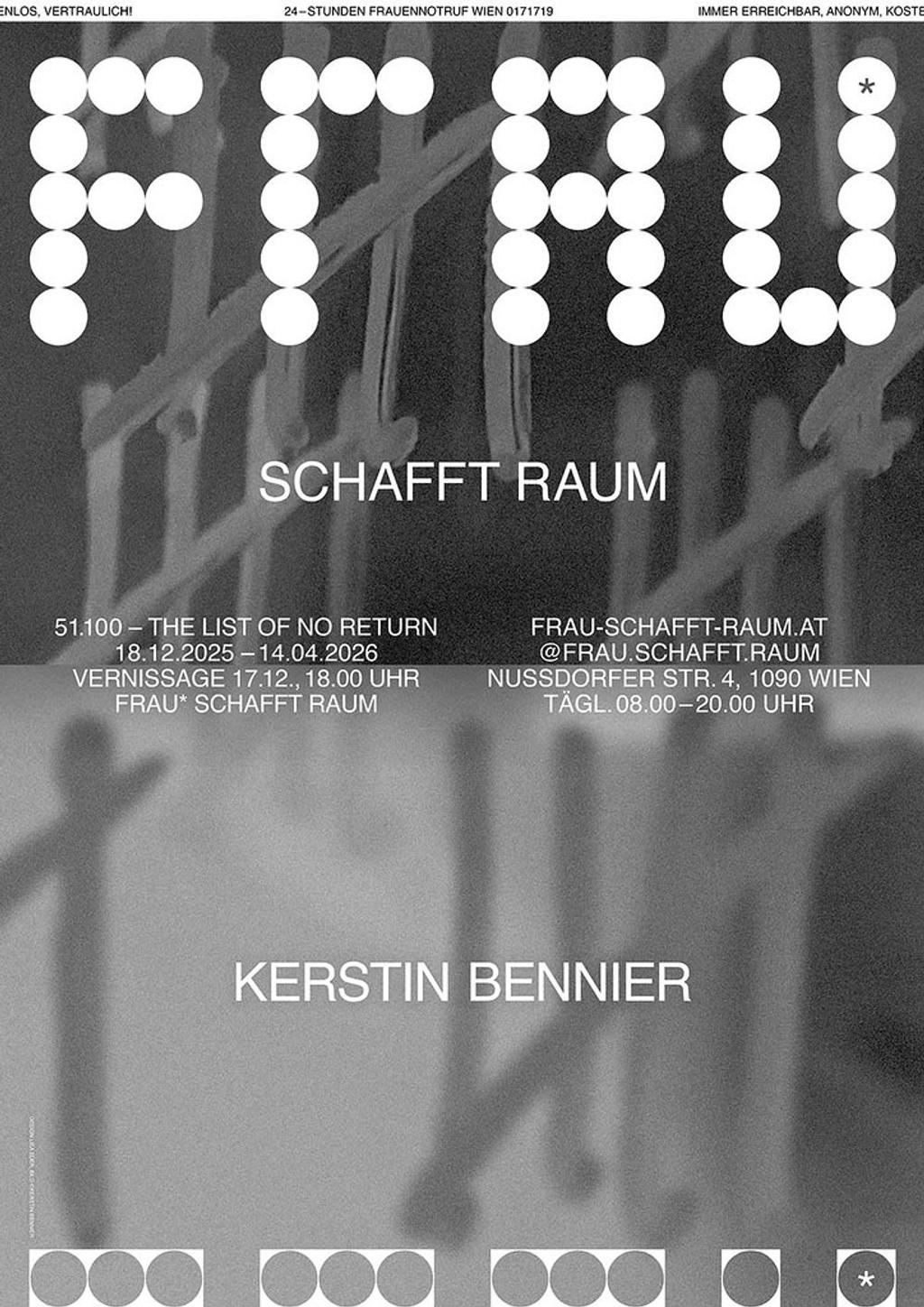 Kerstin Benniers Installation „51.100 – The List of No Return” bei FRAU* schafft Raum führt das weltweite Ausmaß von Femiziden vor Augen. Zugleich erinnert sie an den tödlichen Angriff auf die Trafikantin Nadine W., der sich im März 2026 bereits zum fünften Mal jährt.