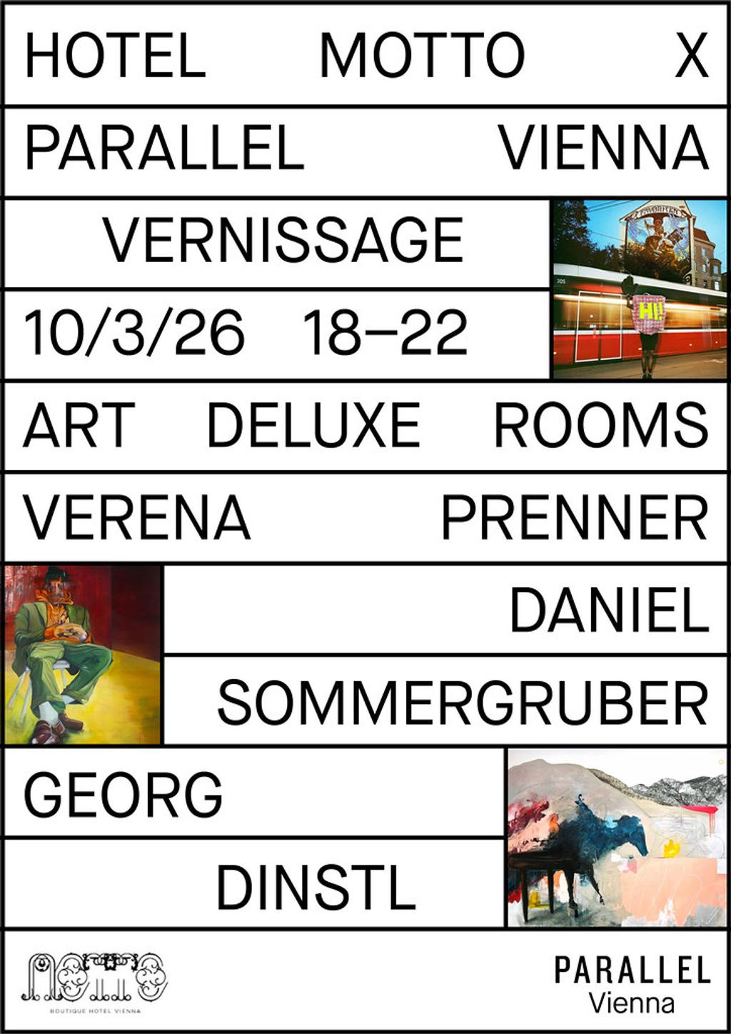 Im Rahmen der PARALLEL Vienna hat das Boutique Hotel MOTTO Georg Dinstl, Daniel Sommergruber und Verena Andrea Prenner eingeladen, jeweils zwei ART DELUXE - Zimmer mit aktuellen Arbeiten zu bespielen.