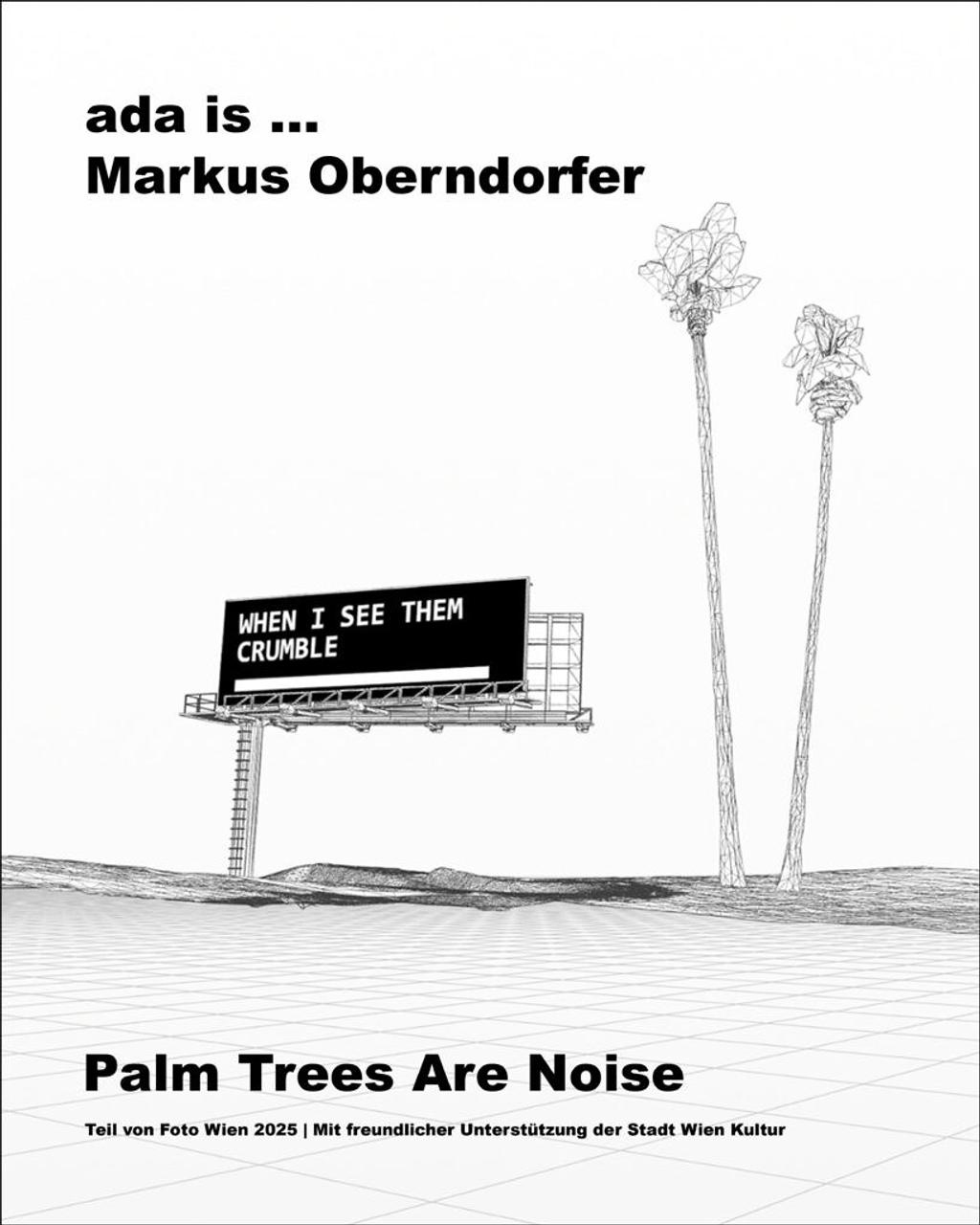 In der Ausstellung Palm Trees Are Noise präsentiert Markus Oberndorfer Auszüge seiner weitreichenden Auseinandersetzung mit virtuellen Bildwelten. Die gleichnamige multimediale Werkgruppe tritt dabei in einen dynamischen Dialog mit Fragmenten verwandter digitaler und analoger Arbeiten aus den Werkzyklen Atlantik Wall und Revisited. In den Ausstellungsräumen des Off-Spaces ada begegnen sich so fotografisch dokumentierte geschichtsträchtige Objekte wie die Überreste des Atlantikwalls auf Cap Ferret, popkulturell übercodierte Orte wie der Sunset Strip in Los Angeles — in dessen zahlreichen medialen Repräsentationen Palmen unweigerlich Teil wurden — sowie in den digitalen Raum übertragene Palmen, inspiriert von Ed Ruschas Buch A Few Palm Trees (1971). Durch diese Gegenüberstellung von historisch verankerten Relikten, kulturell aufgeladenen Symbolen und algorithmisch generierten Bildwelten, die auf deren Destillaten beruhen, entfaltet sich ein bewusst vielschichtiges Zusammenspiel von Geschichte, Kultur, medialer Entwicklung und Halluzination.