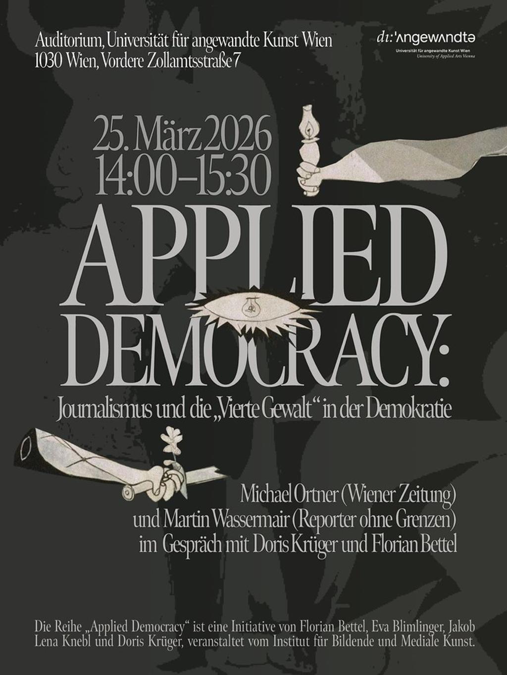Die Reihe Applied Democracy ist eine Initiative von Florian Bettel, Eva Blimlinger, Jakob Lena Knebl und Doris Krüger. Im Zeitalter der Polykrise, wo ein entfesselter Kapitalismus mit dem Rückbau sozialstaatlicher Institutionen, politischer Mobilisierung gegen „die Anderen“ und Imperialismus zusammenwirken, erlangt die Frage nach der Funktionsweise der liberalen Demokratie und den Voraussetzungen für den freiheitlichen, säkularisierten Staat eine gewisse Dringlichkeit. Applied Democracy soll dafür eine Plattform des Diskurses schaffen und gemeinsam mit Akteur*innen aus der Politik und Zivilgesellschaft einen Wissenstransfer ermöglichen.