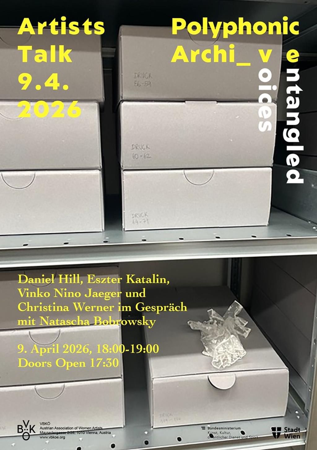 As part of the exhibition Polyphonic Archives, Entangled Voices and the VBKÖ Archive Residency Program, VBKÖ hosts an artist talk with Daniel Hill, Eszter Katalin, Vinko Nino Jaeger and Christina Werner, moderated by Natascha Bobrowsky.