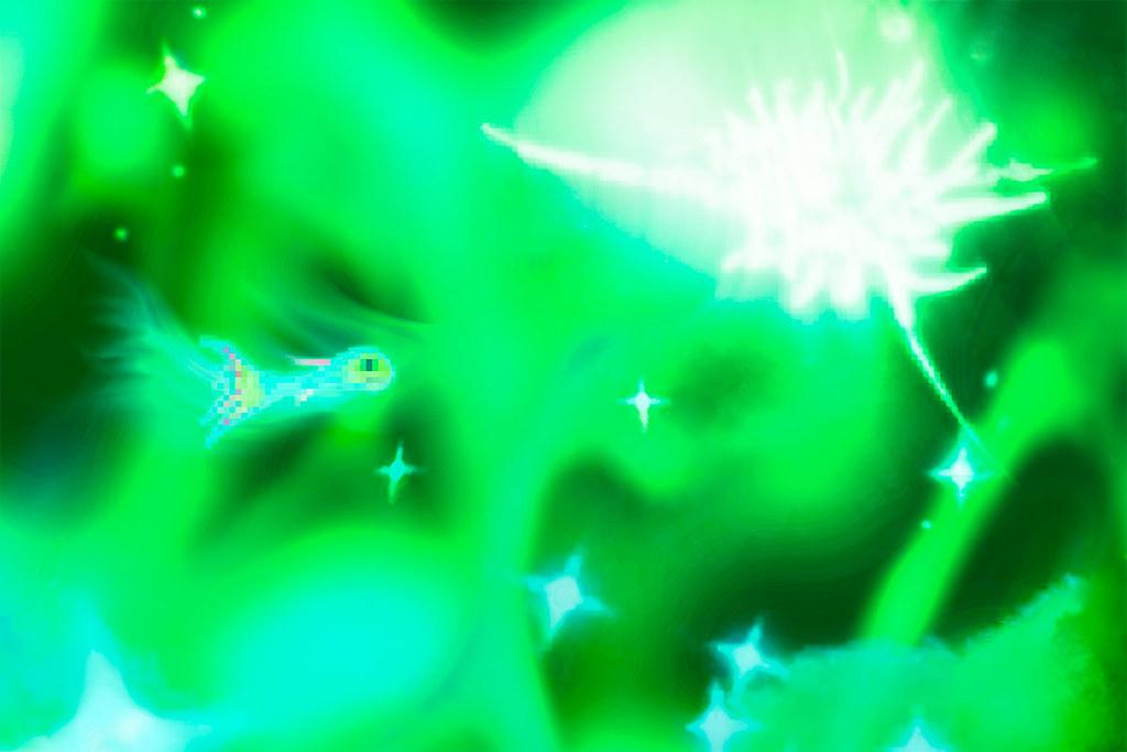 Who i why’s Videoarbeit “I love fishing” isst sich selbst auf. Durch wiederholte Videokomprimierung zerfallen die animierten Videos im Verlauf der Ausstellung nach und nach. So stößt die Arbeit eine Vision einer weniger ausbeuterischen digitalen Zukunft an.