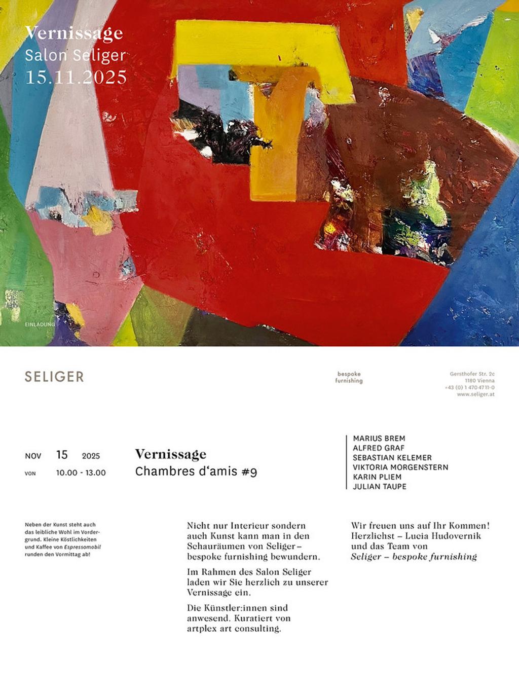 Die Ausstellungsreihe Chambres d’amis zeigt seit 2016 Arbeiten unterschiedlicher KünstlerInnen im Rahmen des Salon Seliger. Nicht wie üblich im White Cube, sondern im Ambiente eines Geschäfts, das auf hochwertiges Interior Design spezialisiert ist und in dessen Räumlichkeiten die teilnehmenden KünstlerInnen stellvertretend mit ihren Werken zu Gast sind. Der Ausstellungstitel versteht sich als Referenz an jene berühmte gleichnamige Schau des belgischen Ausstellungsmachers und Leiters der Documenta IX Jan Hoet von 1986, der die Kunstwerke nicht im Museum, sondern in 60 privaten Wohnungen in ganz Gent präsentierte.
