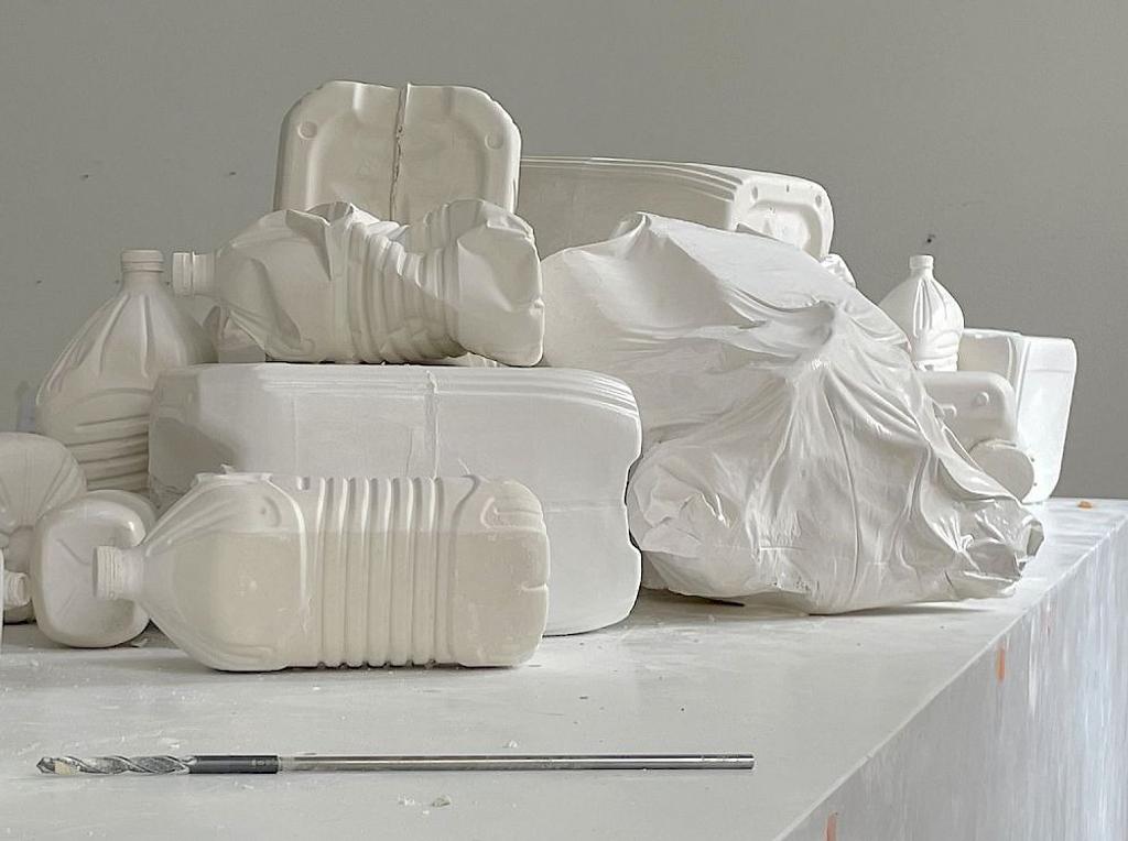 Am Wiener Graben baut sie auf einem eisblockartigen Sockel ein Stillleben aus Flaschen, Kanistern und Säcken auf, die sie von Plastikbehältern abgegossen hat. Die hellen seidenmatten Oberflächen der Objekte lassen an Knochen oder Stein denken. Das keramische Abgussmaterial gibt kleinste Details wieder: die feinen Rillen der Flaschendeckel, die erhabene Schrift auf Containern mit der Angabe von Füllmengen oder Produktinformationen. Der Faltenwurf der Säcke erinnert an marmorne Barockskulpturen, der reflektierende Glanz des Sockels an die Stuckmarmortechnik des Stucco lustro.