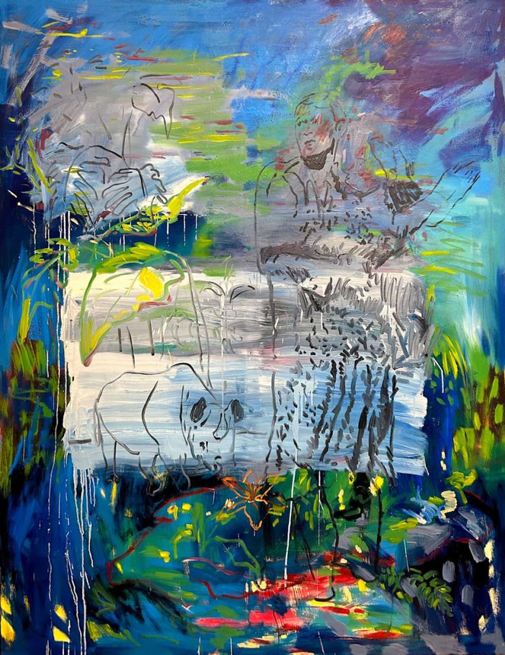 „Dancing Together“ – Auflehnung gegen Krieg und Gewalt. Ein Bild von der iranisch-österreichischen Künstlerin Donya Aalipour, das Aufmerksamkeit verlangt. Gemalt in leuchtenden und satten Farben, mit kraftvollen und widerspenstigen Linien. Zu sehen ist ein Paar, das sich umschlungen hält, das tanzt. Das Mullah-Regime verbietet, öffentlich zu tanzen. So erzählt Donya Aalipour von Ermutigung, von Lebenswillen und von Widerstand gegen totalitäre Herrschaft. Mit zarter Poesie geißelt sie brutale Gewalt. Und sie appelliert, kühn und pastös, sich eigener Kraft zu vergewissern, feinsinnig transportiert durch ein Nashorn. Entschlossen geht es voran, bereit zum Kampf. Kräftige Blautöne dominieren den Hintergrund – Farben des Himmels, der Freiheit und kosmischer Verbundenheit.