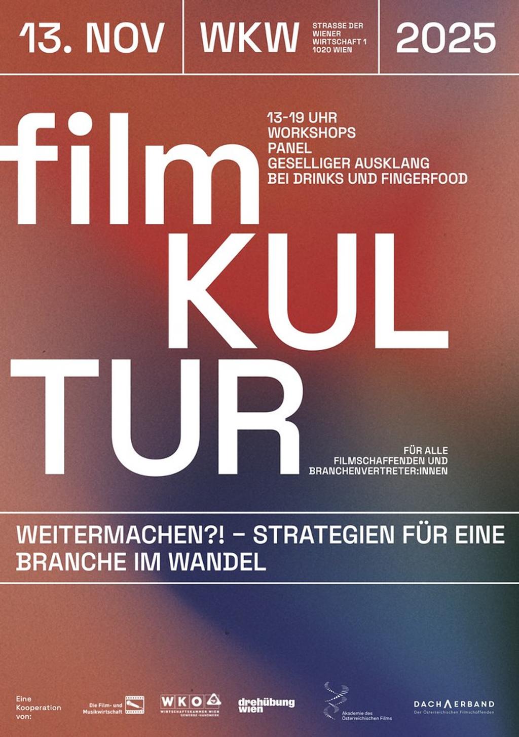 Am 13. November 2025 findet die nächste Ausgabe von filmKULTUR statt. Wir widmen uns unter dem Titel „Weitermachen?! – Strategien für eine Branche im Wandel“ in Workshops und einer Paneldiskussion der Frage, wie ein Arbeiten unter immer schwierigeren Rahmenbedingungen dennoch gelingen kann.