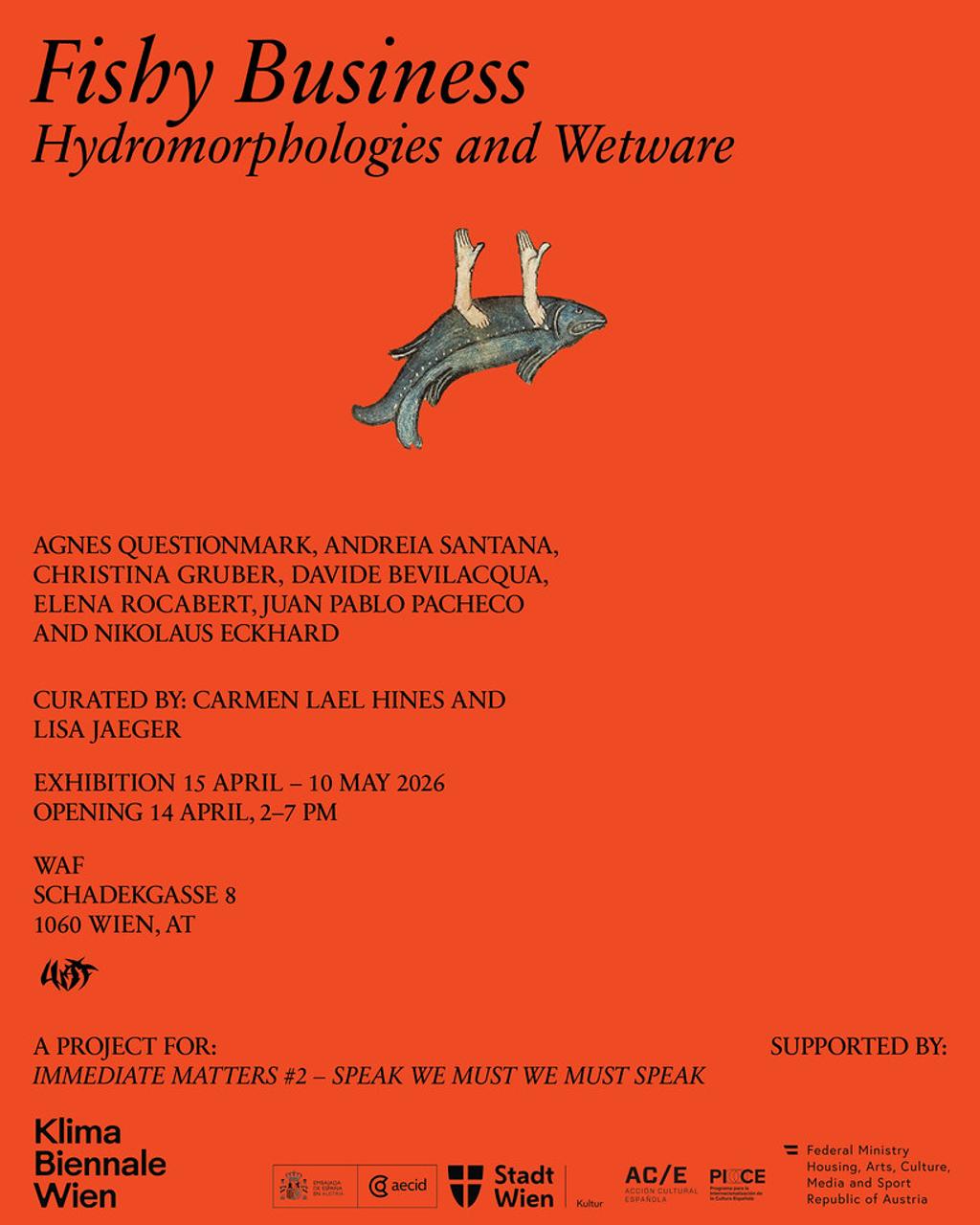 Curated by Carmen Lael Hines and Lisa Jäger, the exhibition will include artistic positions from Agnes Questionmark, Andreia Santana, Juan Pablo Pacheco, Elena Rocabert, Nikolaus Eckhard, and Christina Gruber. Works will take place both in and outside the exhibition space, including early morning canoeing on the Danube, LARPing, workshops, and open discussions. Questions surfacing across the projects relate to how humans attempt to interface with aquatic species—from the supportive technologies designed to aid marine animals to the mythological imagination of hybrid forms such as merpeople. By weaving together speculative design, biology, mythology, and architecture, the exhibition seeks to nurture a transdisciplinary platform for discussion, performance, and play. Realized with the support of Acción Cultural Española (AC/E ), La Embajada de España | Spanische Botschaft, Stadt Wien Kultur and BMWKMS.