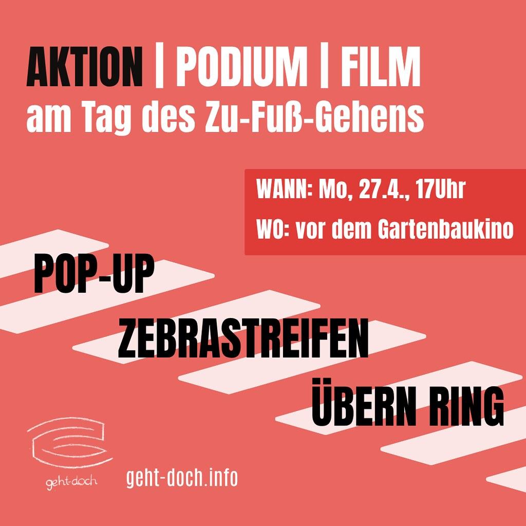 17:00 Intervention Geht-Doch: Wir nehmen uns den Stadtraum und erschaffen temporär einen Pop-up Zebrastreifen über den Ring, wo er seit Jahren für ein sicheres Queren fehlt. Vor dem Gartenbaukino wird der Zebrastreifen feierlich entrollt.