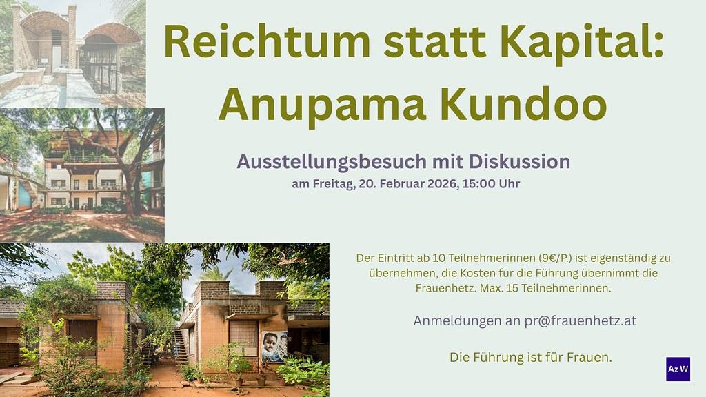 Architektur war lange eine treibende Kraft für Innovation und Wachstum und ist dabei zur Materialisierung des globalen Kapitals geworden. Weltweit werden natürliche Ressourcen und Arbeitskräfte ausgebeutet; gleichzeitig können sich viele Menschen ihre Wohnungen nicht mehr leisten. Das Werk der in Indien geborenen Architektin Anupama Kundoo steht exemplarisch für eine andere Art von Architektur. Mit lokalen Ressourcen entwirft Kundoo Gebäude von außerordentlicher Schönheit, die Sorge tragen für die Bedürfnisse von Mensch und Planet. Im Anschluss gibt es Raum zur gemeinsamen Diskussion der Ausstellung.