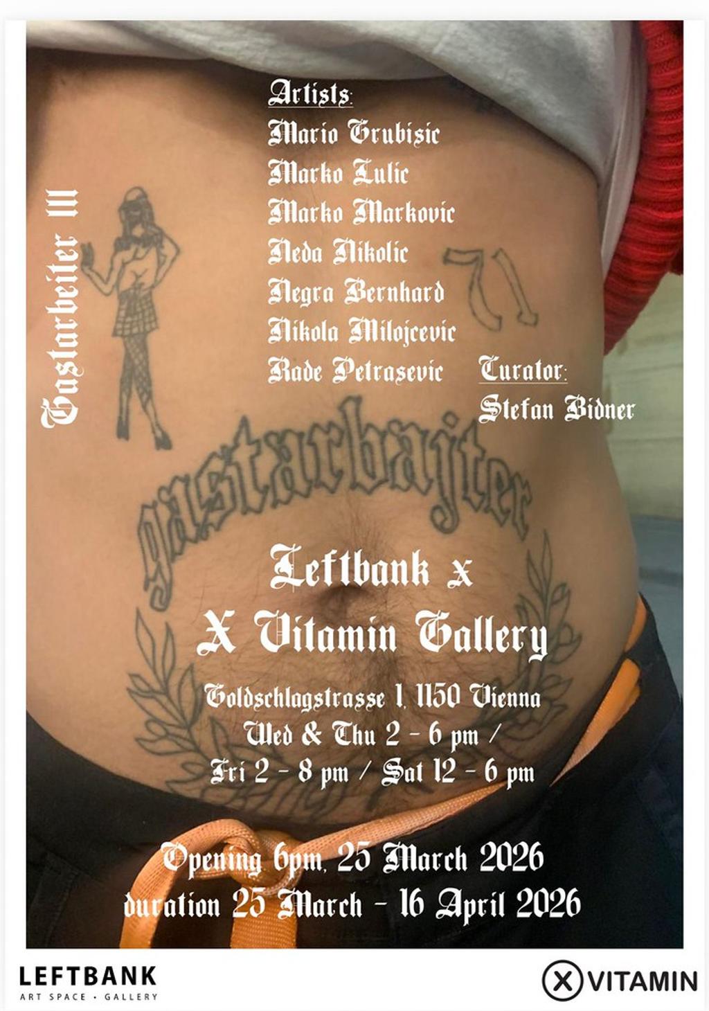 Die Gruppenausstellung Gastarbeiter III wird von der Vitamin X Gallery, Belgrad, in Zusammenarbeit mit LEFTBANK, Wien, präsentiert und zeigt Werke von sieben internationalen Künstlern, die als Immigranten in Wien leben und arbeiten. Die Ausstellung läuft vom 25. März bis 16. April 2026, wird von Stefan Bidner kuratiert und versammelt Positionen von Mario Grubisić, Marko Lulić, Neda Nikolić, Negra Bernhard, Nikola Milojčević, Rade Petrašević und Masa Stanić — Künstlern, deren Werk durch die Erfahrung des Lebens jenseits kultureller und nationaler Grenzen geprägt ist. Mit der Eröffnung am Mittwoch, dem 25. März, setzt LEFTBANK einen weiteren Schritt im Aufbau eines Programms, das international bedeutende Künstlerinnen und Künstler in das Leben des 15. Bezirks einbettet.