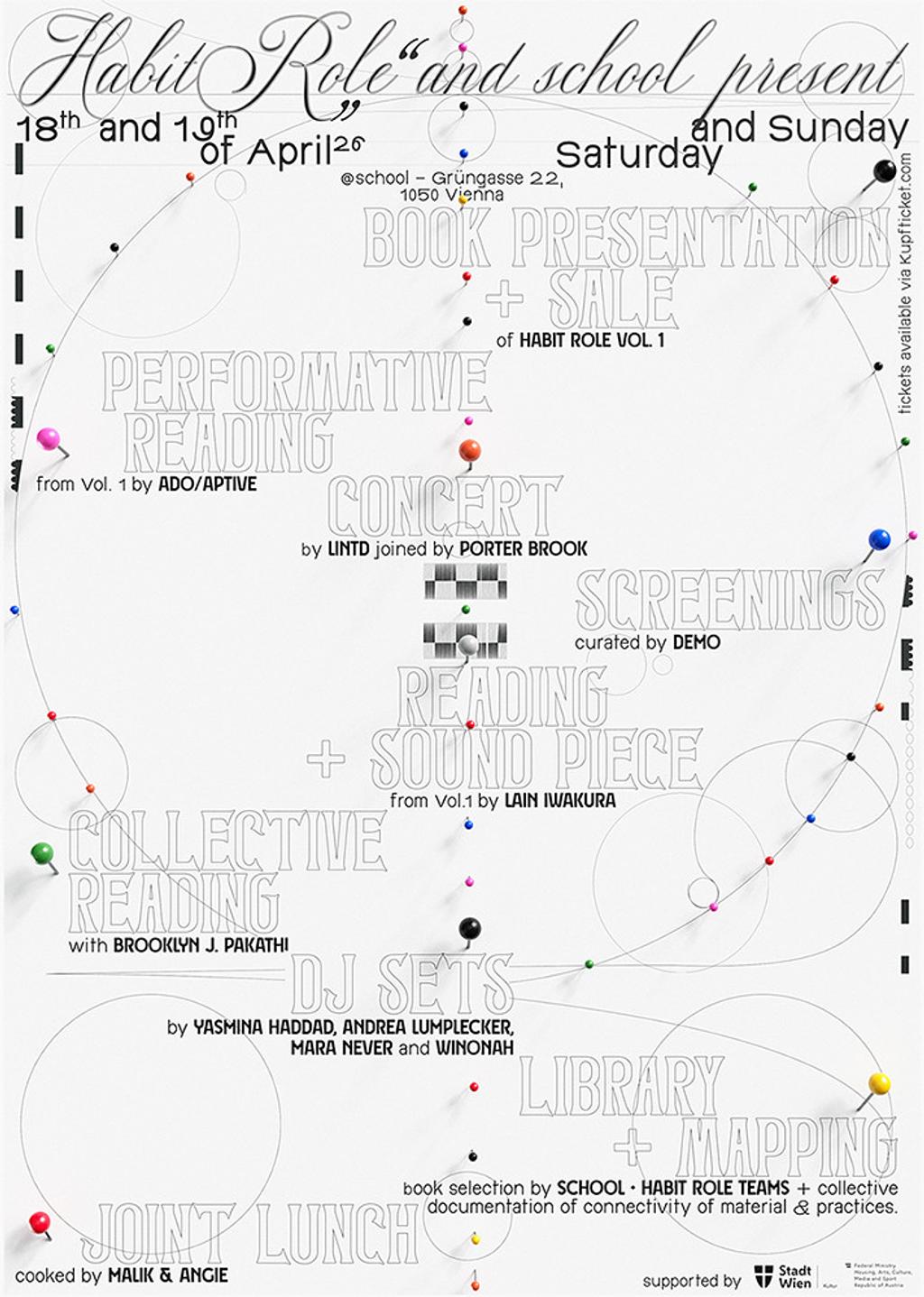 For the official release of its first book, Habit Role teams up with school. Together, they will host a weekend programme featuring various readings from Habit Role Vol. 1, a concert, a shared lunch, DJ sets, a screening, and an open library with a selection curated by the collectives’ members. The event will also include a collaboratively evolving map reflecting the gathering’s components and their inter- and trans-connectivity – and, of course, the sale of Habit Role Vol. 1 as well as school’s Object #10 (2025).