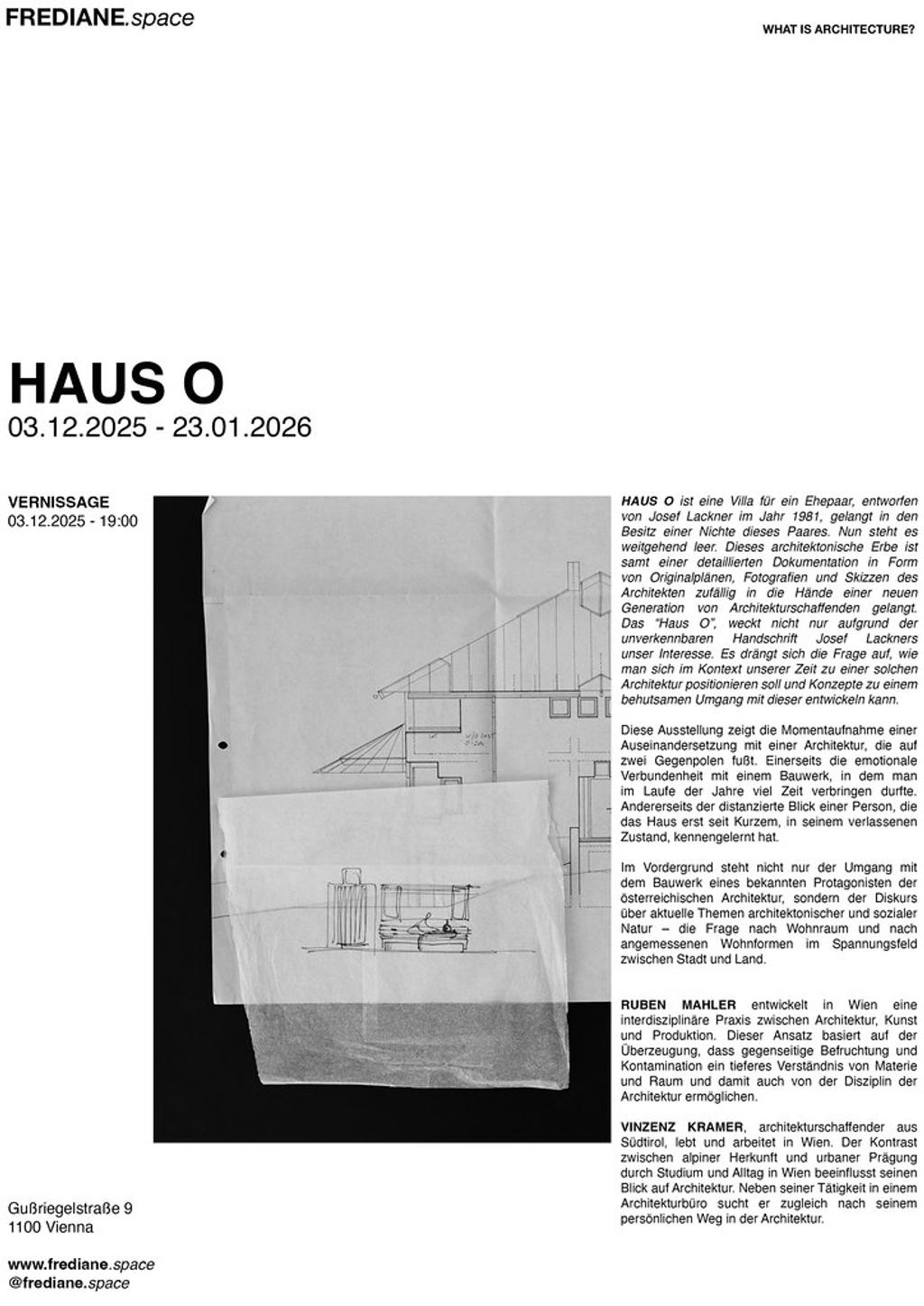 HAUS O widmet sich einem beinahe vergessenen Wohnhaus des österreichischen Architekten Josef Lackner, einem Ort zwischen Erinnerung, Leere und zeitgenössischen Fragestellungen. Die Ausstellung zeigt eine lebendige Auseinandersetzung mit diesem Erbe und stellt die Frage, wie die Architektur heute generationenübergreifend weitergedacht werden kann.