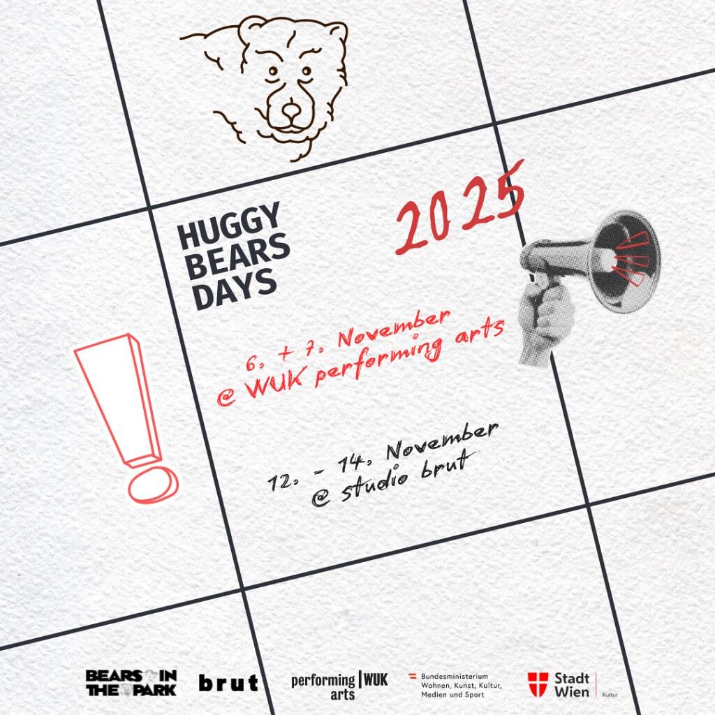 Huggy Bears steht seit 2016 für innovative Performancekunst für ihn Wien lebende Künstler*innen. Als Supporting-Programm bietet es jedes Jahr drei bis vier Einzelpersonen oder Kollektiven ein umfangreiches Supportangebot von Produktion über Verwaltung bis hin zu Technik und Dramaturgie. Durch eine Reihe von unterschiedlichen Aufführungsformaten sowie regelmäßige Feedback-Sessions in der Gruppe formen sich die Projekte der Nachwuchskünstler*innen zu ganz besonderen Stücken. Am Ende des neunmonatigen Programms stellen die Mentees zum ersten Mal ihr Performanceprojekt auf einer großen Wiener Bühne vor. Auch dieses Jahr finden die Huggy Bears Days wieder in einer Kooperation von brut Wien und WUK performing arts statt. Hinter dem Programm steht die Initiative Bears in the Park, die von Philippe Riéra und Charlotte Bastam geleitet wird. Sie hat sich zur Herzensaufgabe gemacht, die freie und transdisziplinäre Performanceszene in Wien zu unterstützen und wachsen zu lassen. Für die Huggy Bears stehen dabei nicht nur feste Ansprechpartner*innen, sondern auch Proberäume in ausgestatteten Studios im 11. Bezirk parat. Bears in the Park veröffentlicht jedes Jahr im Herbst einen Open Call, auf den sich Künstler*innen mit ihren Projekten für das Folgejahr bewerben können. .