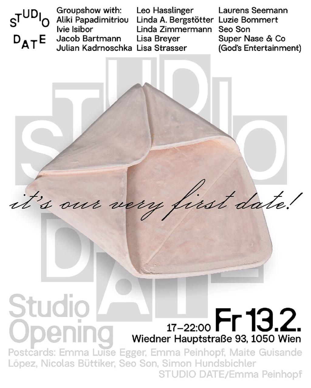 Zwischen Freitag, dem 13., und dem Valentinstag eröffnet STUDIO DATE mit einer Ausstellung und Studioeröffnung. Gezeigt werden Arbeiten von eingeladenen Künstler:innen in einem Raum zwischen Werkstatt und Ausstellung. STUDIO DATE wird künftig als Atelier und Keramikstudio genutzt und bietet Raum für Kurse, Workshops und weitere Veranstaltungen. Kommt vorbei und feiert diesen ersten Moment. Vielleicht ist es Liebe auf den ersten Blick.