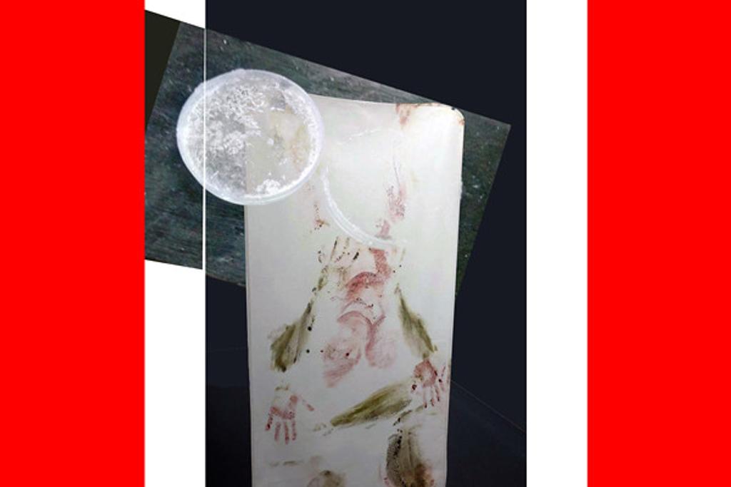 Tableau Vivant is a new work by Jatun Risba that unfolds as both a participatory body-printing performance and an installation, engaging two of the artist’s longstanding material collaborators: menstrual blood and liquid chlorophyll. The work centres on a large piece of cloth bearing a printed map of ongoing armed conflicts across the world. Through direct bodily contact, facilitated by audience participation, the artist produces body prints on the reverse side of the cloth, which is left to dry and subsequently treated with a urea solution, initiating the growth of crystalline formations.