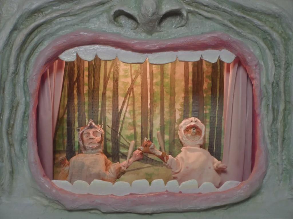 For the Viennese iteration of the video installation Le Roman de Remort(1), Marion Lessard transforms the gallery space into a lair visible from the street through a giant papier-mâché mouth. Through this in situ gaping hole, which fills and materializes the entire interstitial space of the window, passers-by are drawn to behold multiple reflections depending on the hour of the day or night: at times, they will catch sight of a film(2) that revisits, reenacts, and diverts the medieval animal fables of Le Roman de Renart [Reynard the Fox] into our era of the Ultimate Carnival; at other times, they will face the emptiness of a depopulated screening room, a cavity open to all forms of fantastical projection; or again, they may catch their own image, trapped on the hyaline surface encircled by Remort’s throat. The exhibition invites viewers to explore the vibrant energies of carnival, masks, and puppetry; to embrace the dizzying mise-en-abyme of the Verb, so specific to human existence; and to make space for the “bite of conscience” which, today, seems to clamp every joy within its parenthetical brackets.