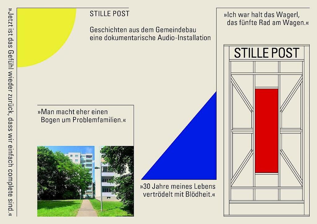 „Stille Post“ verknüpft das historische Erbe des Roten Wiens der 1920er Jahre mit aktuellen Fragen nach Gemeinschaft, Öffentlichkeit und Privatsphäre. Kunst im öffentlichen Raum setzt sich heute mittels aller möglicher Kunstformen mit essenziellen Bedürfnissen der Gesellschaft auseinander. Laura Andreß macht dies ganz ausdrücklich, indem sie die Menschen selber mit ihren Geschichten das Kunstwerk bilden lässt.