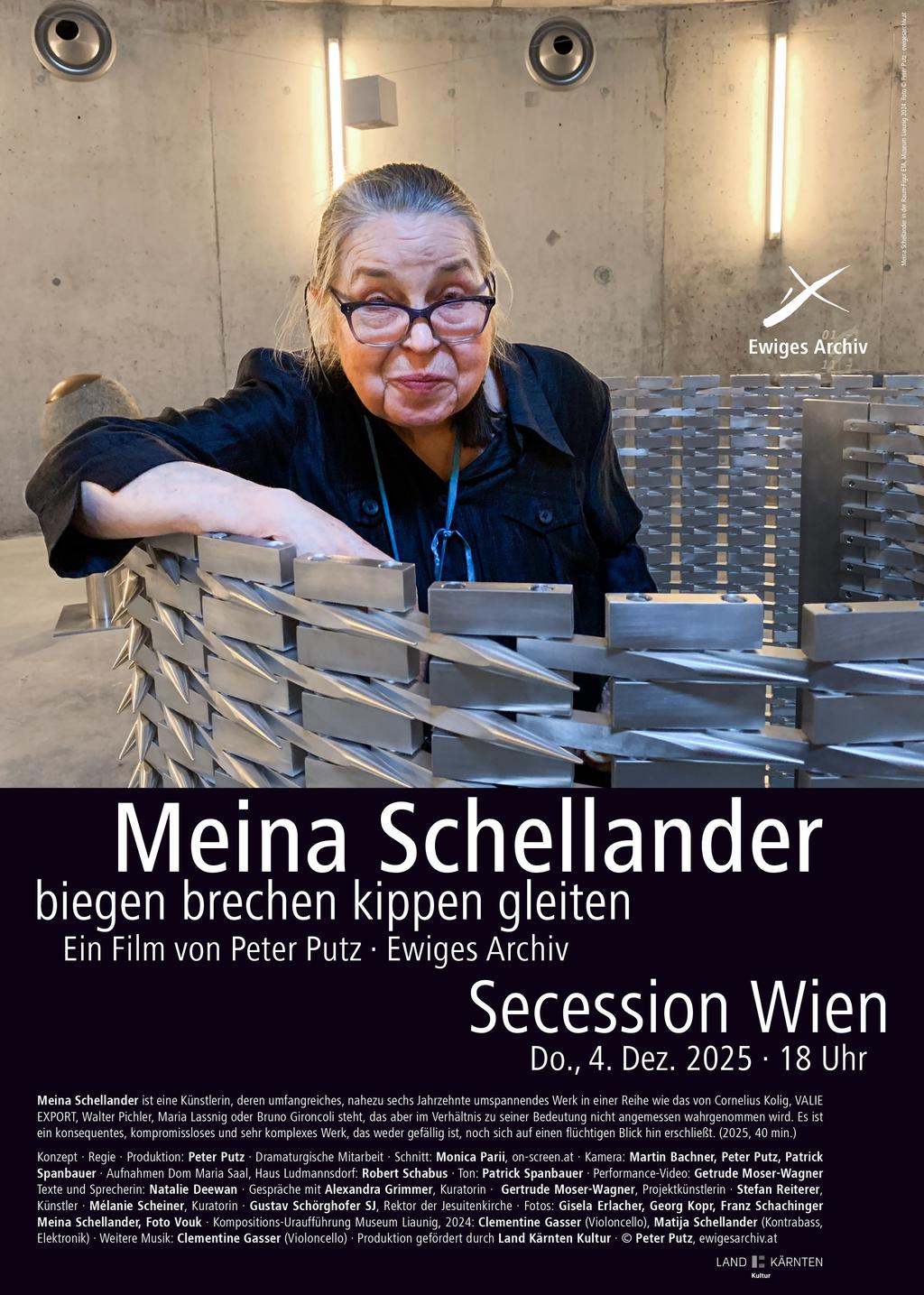 Meina Schellander ist eine Künstlerin, deren umfangreiches, nahezu sechs Jahrzehnte umspannendes Werk in einer Reihe wie das von Cornelius Kolig, Valie Export, Walter Pichler, Maria Lassnig oder Bruno Gironcoli steht, das aber im Verhältnis zu seiner Bedeutung nicht angemessen wahrgenommen wird. Es ist ein konsequentes, kompromissloses und sehr komplexes Werk, das weder gefällig ist, noch sich auf einen flüchtigen Blick hin erschließt.