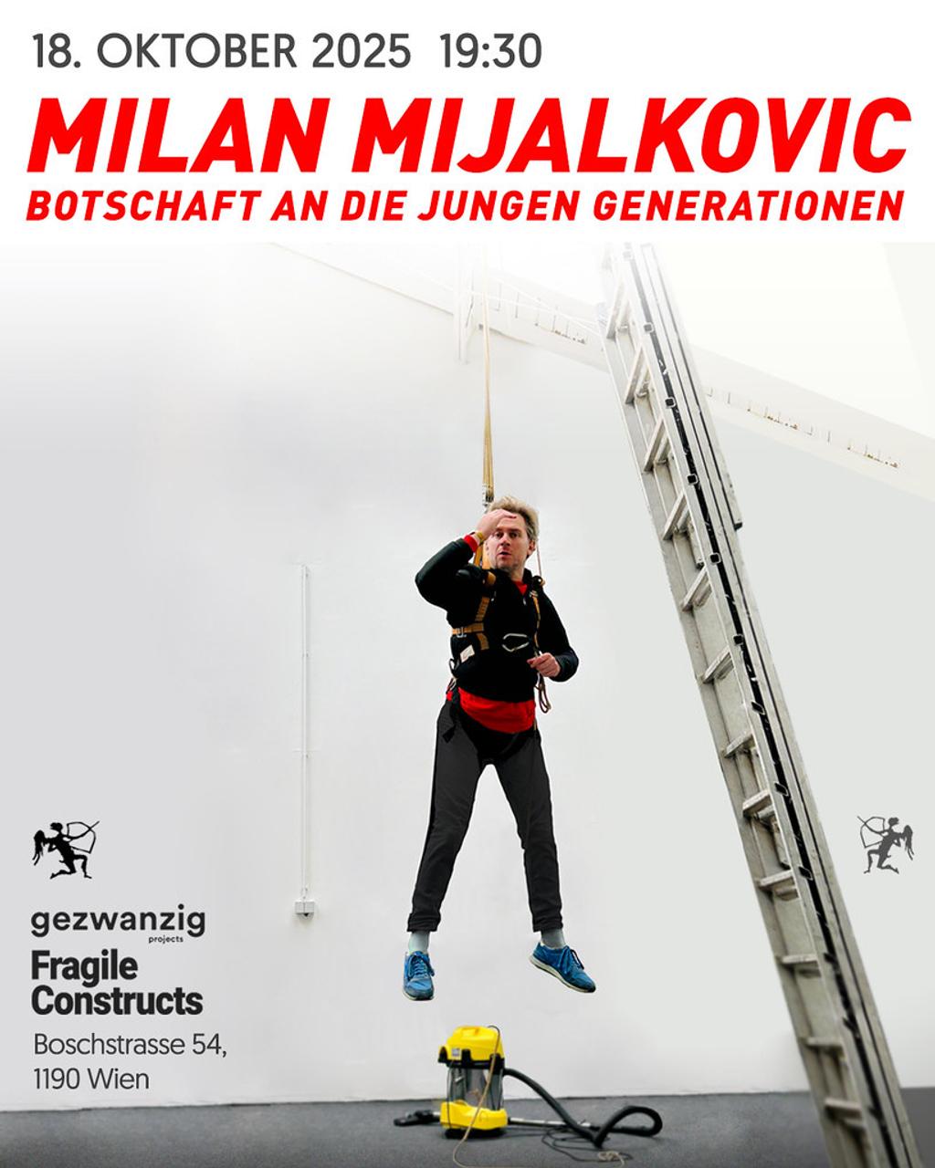 Im Rahmen der Ausstellung Fragile Constructs lade ich zu einer Performance ein – einer Rede über das öffentliche Wort, das längst leichter wiegt als heiße Luft, und über Verantwortung in einer Zeit, die von Krieg, Desinteresse und Konsum geprägt ist. Trotz omnipräsenter politischer Manipulation durch Furcht, medialer Oberflächlichkeit und der Entleerung demokratischer Sprache spreche ich für jene, die sich nicht in Träumen von persönlichem Ruhm und Glück verloren haben: für die jungen Generationen. Ob das gelingt, weiß ich nicht. Ich werde versuchen, sie alle von ganz hoch oben zu erreichen…