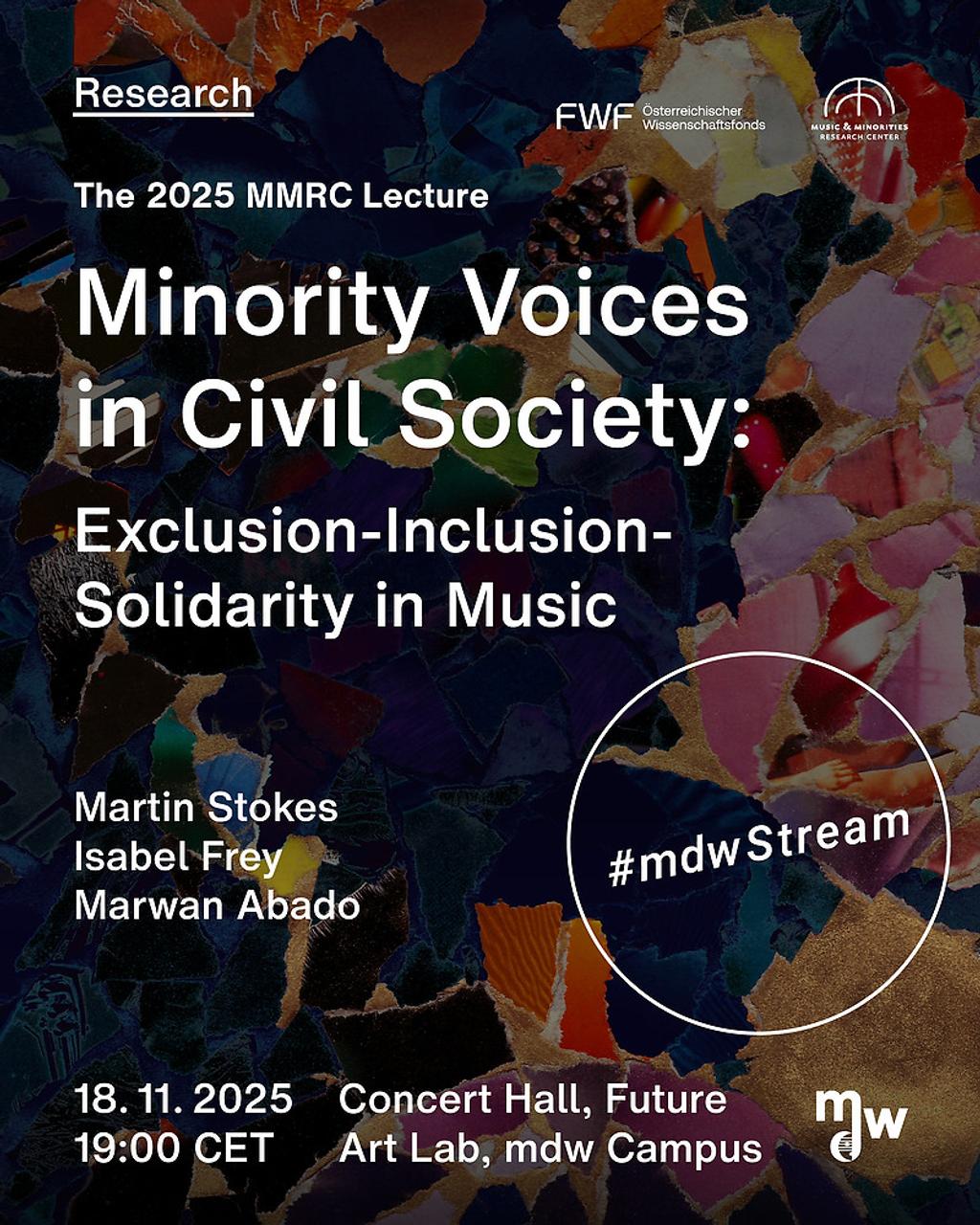 Where do marginalised groups locate themselves within civil society, and how do they express their concerns? How can music contribute to negotiating belonging and participation? What collective cultural and musical practices can be employed to challenge political power and representation dynamics and create spaces for transnational solidarity? The 2025 MMRC Lecture (18.11.2025, 19:00, concert hall, future art lab, mdw) will explore and reflect on these areas of tension from academic and musical perspectives.
