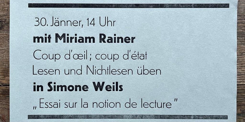 Miriam Rainer stellt ihre Übersetzung von „Essay sur la notion de lecture“ vor. Ihr Übersetzungsvorschlag für den Titel lautet „Versuch über das Lesen.“