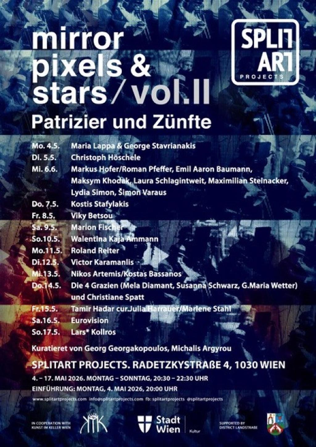 «Mirror, pixel & stars - Patrizier und Zünfte / Nobles and guilds» brings media technology, artists and audiovisual technicians invited by splitart projects wien in May, to produce a spectacular audio-visual ecosystem. The exhibition reaches beyond a limited and conventional display of art and the moving image or film, immersing in the essence of art that blurs the boundaries between mass culture, higher art and kitsch. It touches upon the true nature of contemporary culture.