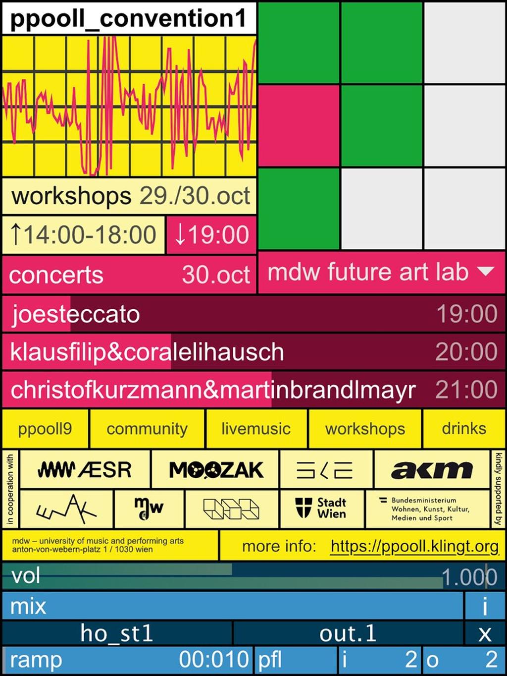 ppooll convention is a cooperation of moozak, aesr – applied/experimental sound research lab, elak – lehrgang für elektroakustische und experimentelle musik, mdw – universität für musik und darstellende kunst wien and echoraeume.