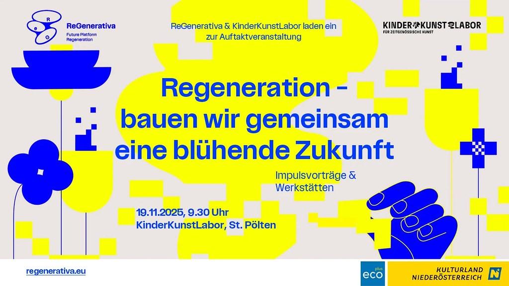 Eröffnung um 9.30 Uhr durch Mona Jas, Künstlerische Leiterin des KinderKunstLabor und Christoph Thun-Hohenstein, Künstlerischer Leiter der Zukunftsplattform ReGenerativa, sowie Hermann Dikowitsch, Leiter der Abteilung Kunst und Kultur beim Amt der NÖ Landesregierung in Vertretung von Landeshauptfrau Johanna Mikl-Leitner. Im Anschluss Impulsvorträge von Künstlerin Veronika Dirnhofer und Schriftsteller Michael Stavarič.
