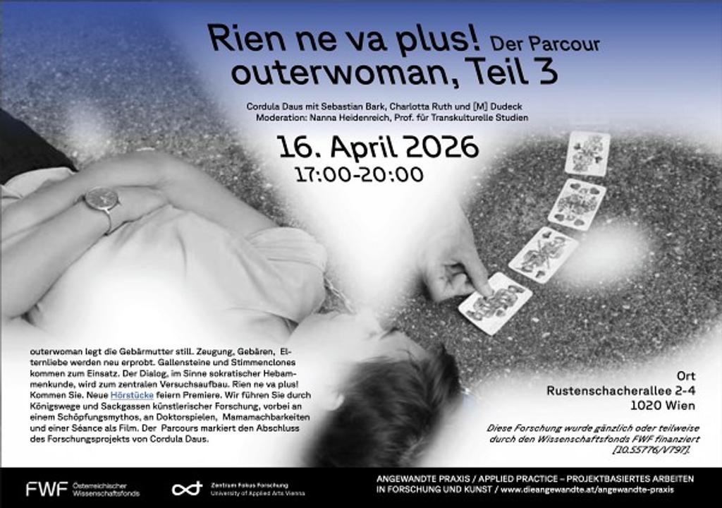 outerwoman legt die Gebärmutter still. Zeugung, Gebären, Elternliebe werden neu erprobt. Gallensteine und Stimmenclones kommen zum Einsatz. Der Dialog, im Sinne sokratischer Hebammenkunde, wird zum zentralen Versuchsaufbau. Rien ne va plus! Kommen Sie. Neue Hörstücke feiern Premiere. Wir führen Sie durch Königswege und Sackgassen künstlerischer Forschung, vorbei an einem Schöpfungsmythos, an Doktorspielen, Mamamachbarkeiten und einer Séance als Film. Der Parcours markiert den Abschluss des Forschungsprojekts von Cordula Daus.