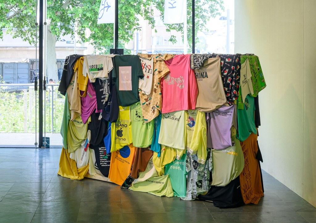 Das in New York ansässige Künstlerinnenduo Shanzhai Lyric präsentiert eine Lesung von Gedichten mit kontextualisierenden Recherchen, die sich auf die aufgedruckten Worte gefundener Kleidungsstücke stützen, aus denen sich die Installation Incomplete Poem (hedge) (2023) zusammensetzt. Die Arbeit besteht aus einer Holzkonstruktion, die mit einer wachsenden Sammlung von Slogan-T-Shirts drapiert wurde – ein Auszug aus dem, was die Künstlerinnen als ein sich ständig entfaltendes Gedicht betrachten. Die Kleidungsstücke verweisen auf die chinesische Shanzhai-Kultur. Shanzhai ist ein Begriff, der ursprünglich „Bergfestung” bedeutete und heute mit Nachahmung, Aneignung und dem subversiven Charakter der Subkulturen assoziiert wird, die sich um die Shanzhai-Kultur herum bilden.