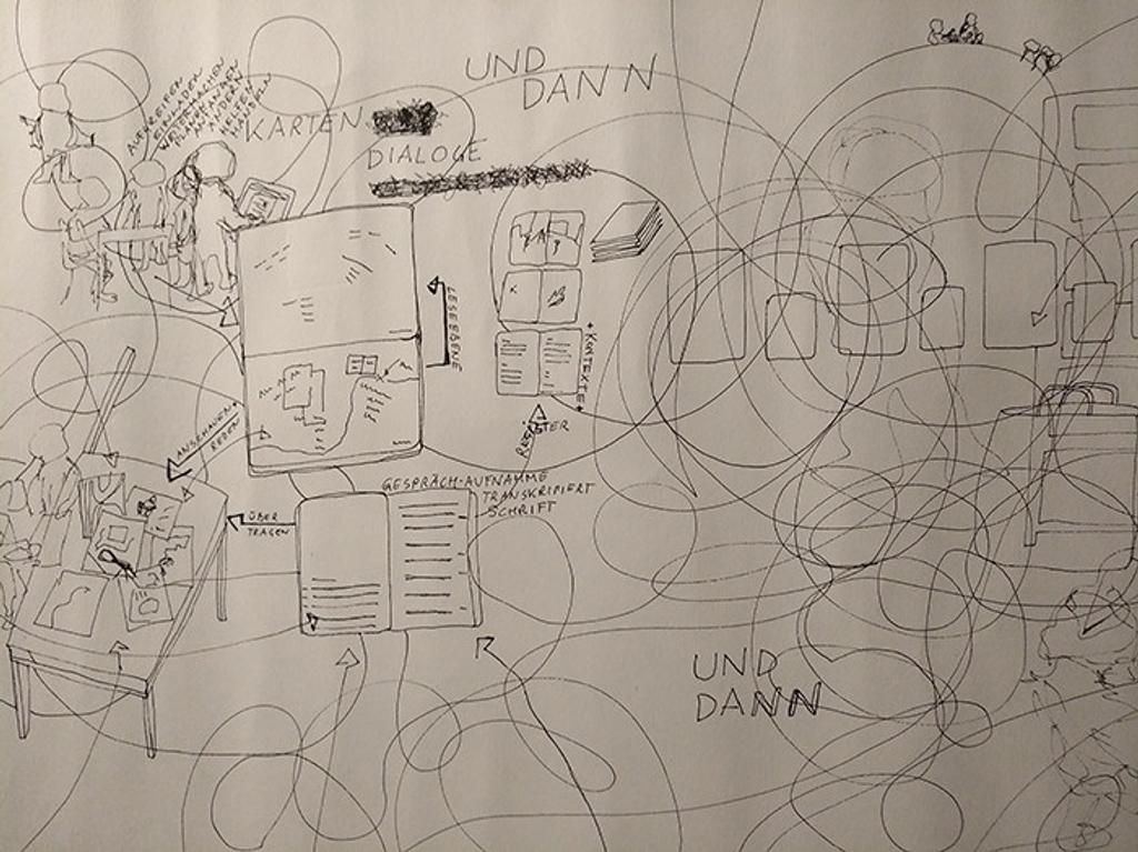 Es ist nicht wichtig, zeichnen zu können. Eine Karte kann aus einfachen Markierungen und Schrift bestehen. Vergnügen am Zeichnen zu haben, ist nicht schlecht. Und die Karten sind komplexe Notizen zur Ausstellung, die für weitere Reflexionen verwendet werden können – immer wieder.