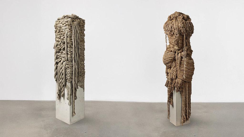 Im Kirchenraum entfalten sich vertikale, säulenartige Stoffskulpturen, die aus gehärteten Textilbahnen und Seilen bestehen und aus schlichten Betonsockeln herauswachsen. Sie wirken architektonisch und körperhaft zugleich und betonen die Höhe und klaren Linien des Langhauses. Die abstrahierten Formen erinnern an textile Hüllen. Sie verweisen auf den Tschador, einen bodenlangen, dunklen, im Iran traditionellen Umhang, als Symbol sowohl für Schutz als auch für Einschränkung. Das Material – in Acryl und Leim versteift – behält Spuren seiner ursprünglichen Flexibilität und erzeugt eine Spannung zwischen Starrheit und Bewegung.