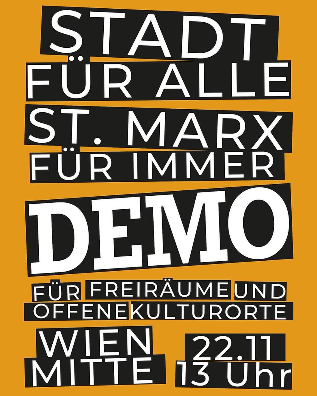 Statt Wertschätzung für unbezahlte Kulturarbeit und kreative Bereicherung des Stadtlebens zu bekommen, sind Freiräume in Wien einem ständigen Überlebenskampf und Verdrängung ausgesetzt. So wie aktuell die Freifläche in St. Marx, wo mit 10.12. den ansässigen Vereinen die Verträge gekündigt werden um Platz für eine Mega Eventhalle für zahlungskräftige Kundschaft zu machen. Das werden wir so nicht hinnehmen und wir wissen: Wir sind in diesem Kampf für nicht-kommerzielle Räume nicht alleine, wir sind viele! In Wien gibt es zahlreiche Menschen, die ihre Stadt selbst gestalten und deshalb wollen wir am 22.11. alle zusammenkommen und uns gemeinsam die Straße nehmen, Spaß haben und mit einem bunten Programm zeigen — und uns selbst daran erinnern — wie wichtig, vielfältig und erkämpfenswert selbstorganisierte Räume in Wien sind.