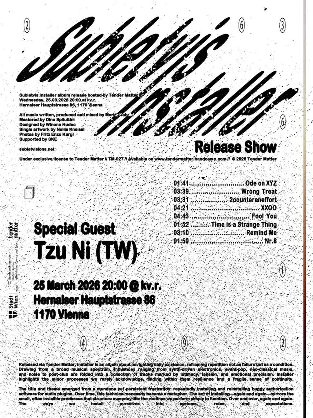 Vienna-based sound artist Moritz Nahold records and performs under the name Subletvis. Situated somewhere between the abstract and the familiar, his work blends a wide range of musical influences into a coherent yet far-reaching sound, charged with intimacy and intensity and driven by a longing to foster blissful encounters.