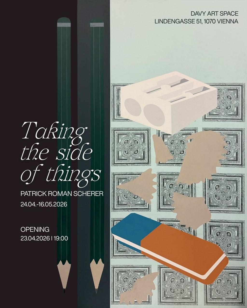Patrick Roman Scherer, geboren 1988 in Kufstein, studierte an der Akademie der Bildenden Künste Wien und hat die Zeichnung zu seinem zentralen Medium gemacht. In seinen Arbeiten beleuchtet er die Bildwürdigkeit von Alltagsgegenständen: Durch die Gegenüberstellung von Gewöhnlichem mit fragilen Ornamenten und feinen Liniengeflechten entsteht ein neuer Kosmos der Dinge, der sich der gewohnten Wahrnehmung entzieht. 2017 wurde ihm der MUSA-Preis der Stadt Wien verliehen.