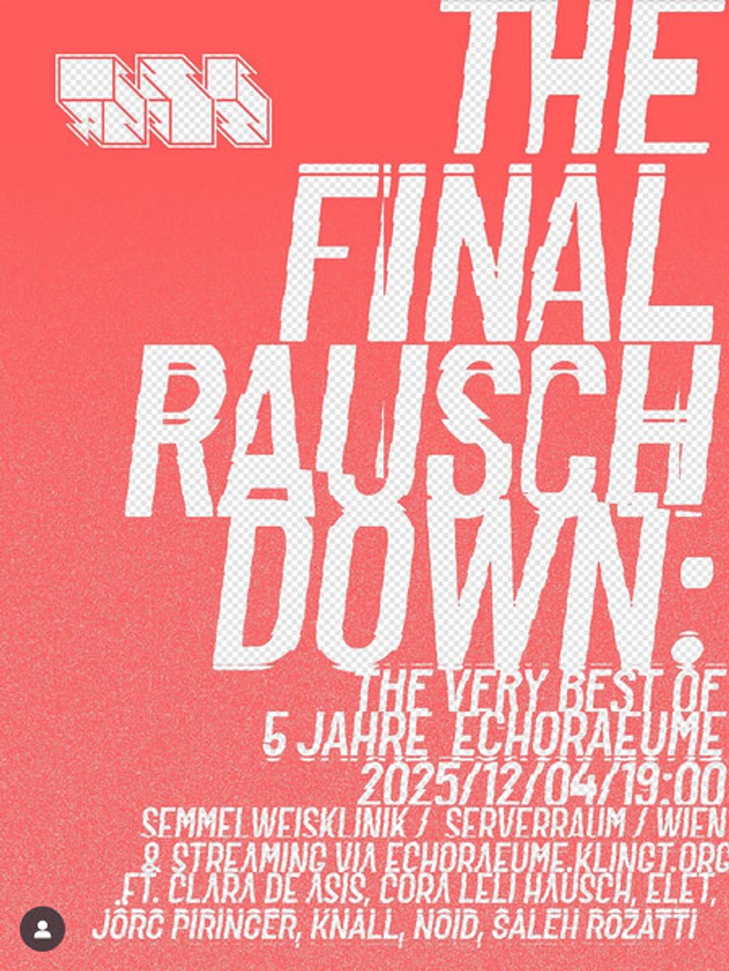 since it’s inception in 2020 the echoraeume crew is running a meta-medial event series called “onlinerauschen”, fusing various concepts like live music, media art, web art and performance. echoraeume is 5 years old now, the pandemic is long gone, and live streaming of concerts was mostly shelved again in favor of physical attendance. some of our temporal digital interventions however were too good not to be reprised. so we’re going offline (again) and will perform them live in the so-called “serverraum” of the lovely semmelweisklinik. fear not though: online streaming will be active as well. our guests for this night will be sound-artist and @discreet_editions label-runner clara de asis and media and performance artist elet from @sandkastensyndikat.