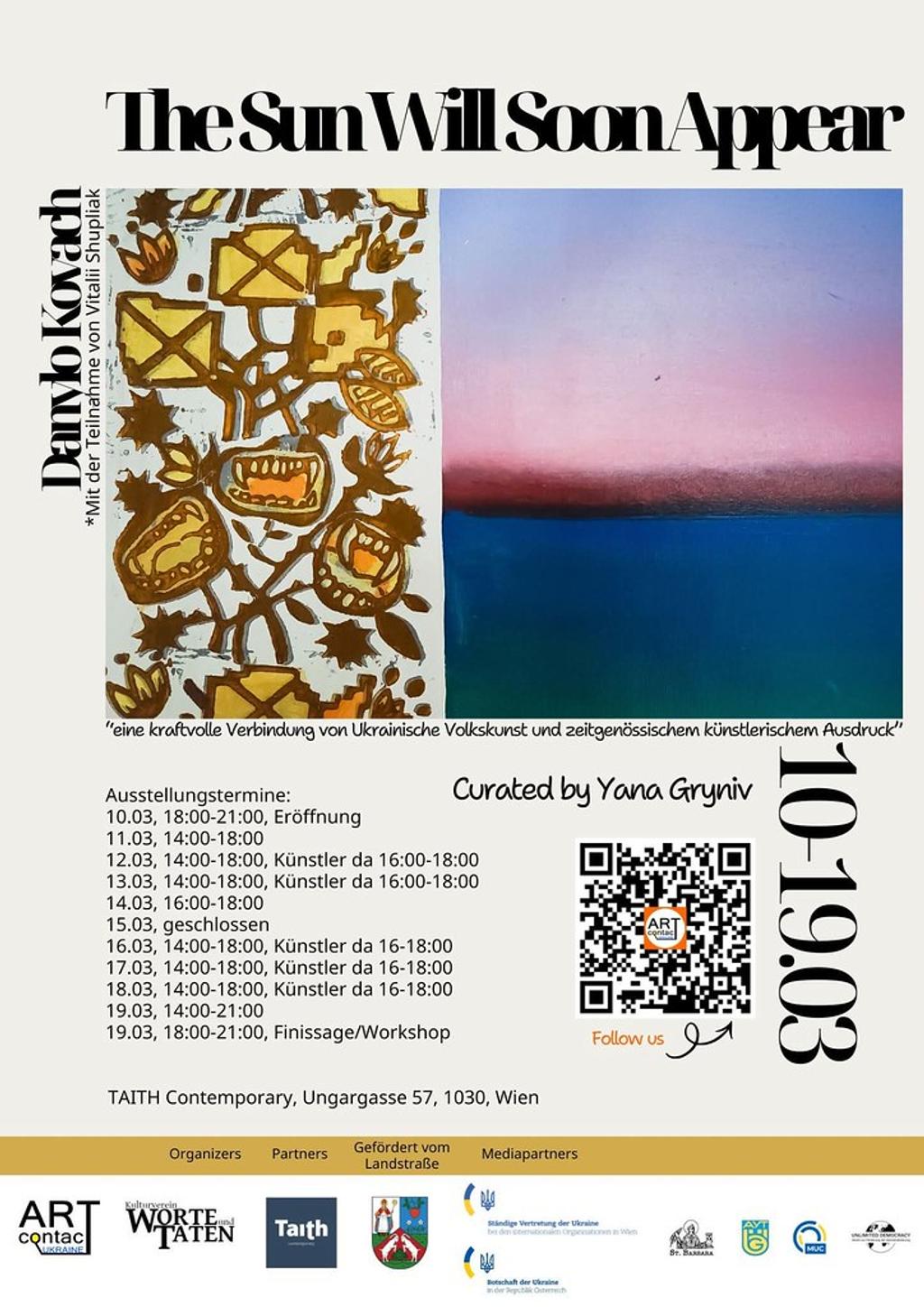 Wir laden Sie herzlich zur Eröffnung der Ausstellung “The Sun Will Soon Appear” ein, mit Werken des Künstlers Danylo Kovach, kuratiert von Yana Gryniv. Die Ausstellung wird ukrainische Stickerei-inspirierte Motive, abstrakte Landschaften, Skulpturen, Hirsche, neon idyllische Wälder, Objekte aus den 1970er Jahren in der Ukraine und die ursprüngliche Stickerei seiner Großmutter zeigen.