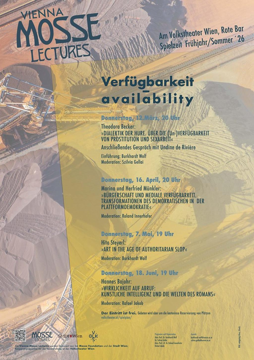 Doch ist es nicht gerade Unverfügbarkeit, an der sich Autonomie, vor allem aber das Politische zu bewähren hat? Und das Nicht-Disponible, worauf letztlich die Wertbildung und vor allem das Wünschen zielt? Die Vienna Mosse Lectures erkunden im Sommer 2026 die Frage der (Un-)Verfügbarkeit mit Blick auf unterschiedlichste Schauplätze: auf das umkämpfte Feld der Prostitution und Sexarbeit; auf die Arena politischer Teilhabe in der heutigen ›Plattform-Demokratie‹; auf die Sphäre einer Kunst, die sich zusehends autoritärer Zugriffe zu erwehren hat; und auf jene fiktionale Wirklichkeit, die zur Domäne künstlicher Intelligenz zu werden droht.