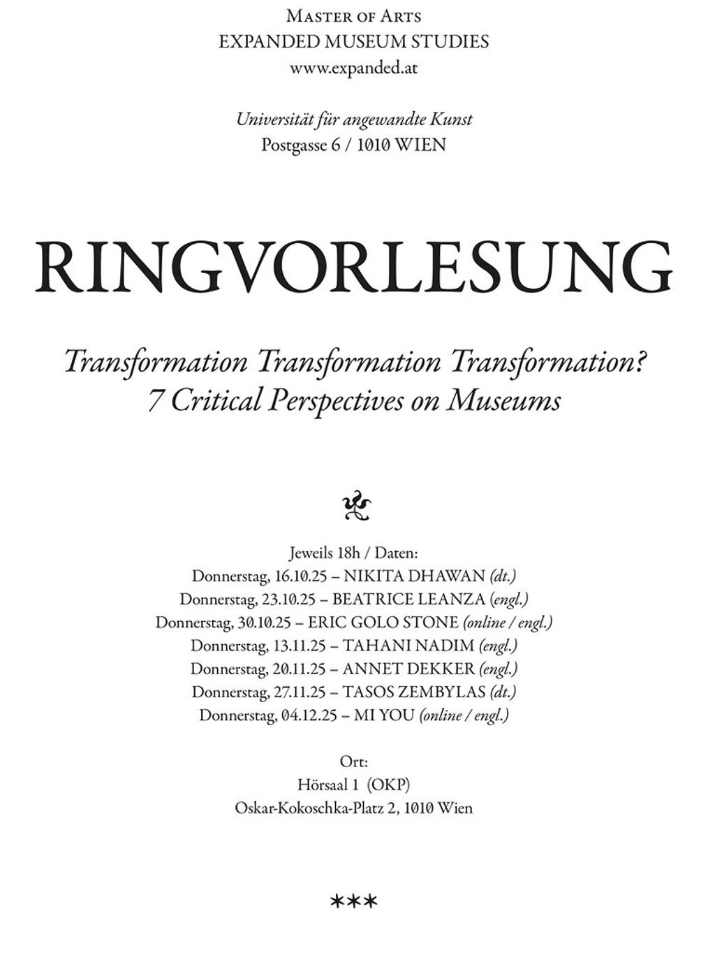 Herzliche Einladung zur ersten Ringvorlesung der Abteilung Expanded Museum Studies.