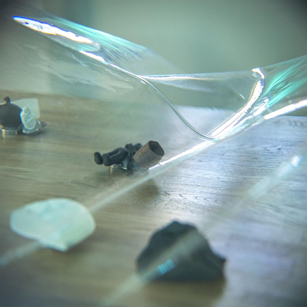 Seit Beginn von FLUVIALE sammelt Verena Tscherner persönliche Gegenstände von Besucher*innen der Veranstaltungen und Ausstellungen. Die von den Besucher*innen abgegebenen Gegenstände werden mit einem 3D-Scanner eingelesen und digital gespeichert. Die aus den Daten im 3D-Druck hergestellten Repliken, werden als individuelle „Spurenelemente” in die Installation integriert. Unter dem Einfluss äußerer Kräfte – in Form von algorithmisch gesteuerten Magnetfeldern – bewegen sich die Objekte in der atmenden Zeitkapsel, geraten dabei in Wechselwirkung aneinander und kollidieren unweigerlich. Durch die Kollisionen schlagen sich die Objekte ab, brechen allmählich auseinander und zermahlen sich gegenseitig.