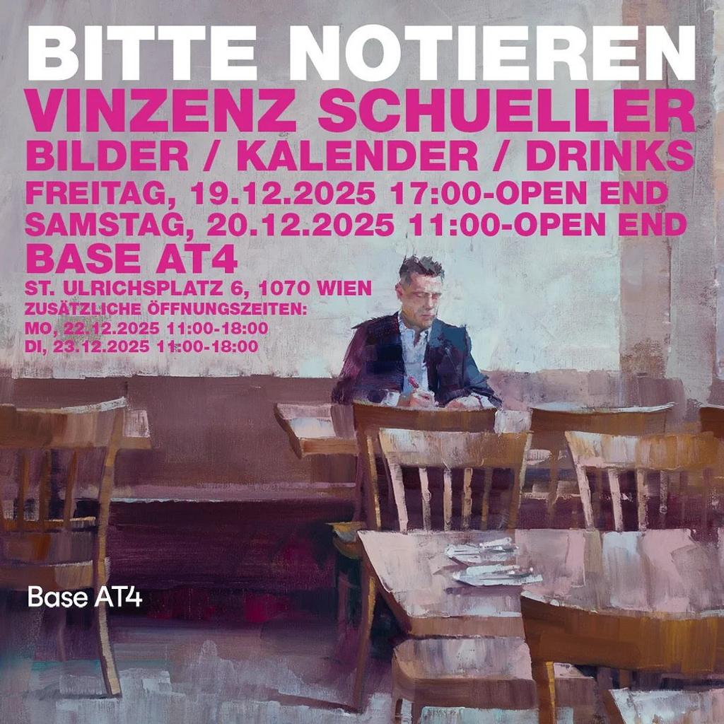 Gezeigt werden ein paar der neuesten Ölbilder von Vinzenz Schüller, man kann den Kalender von 2026 erwerben und es gibt Drinks gegen eine freie Spende. Kommt!