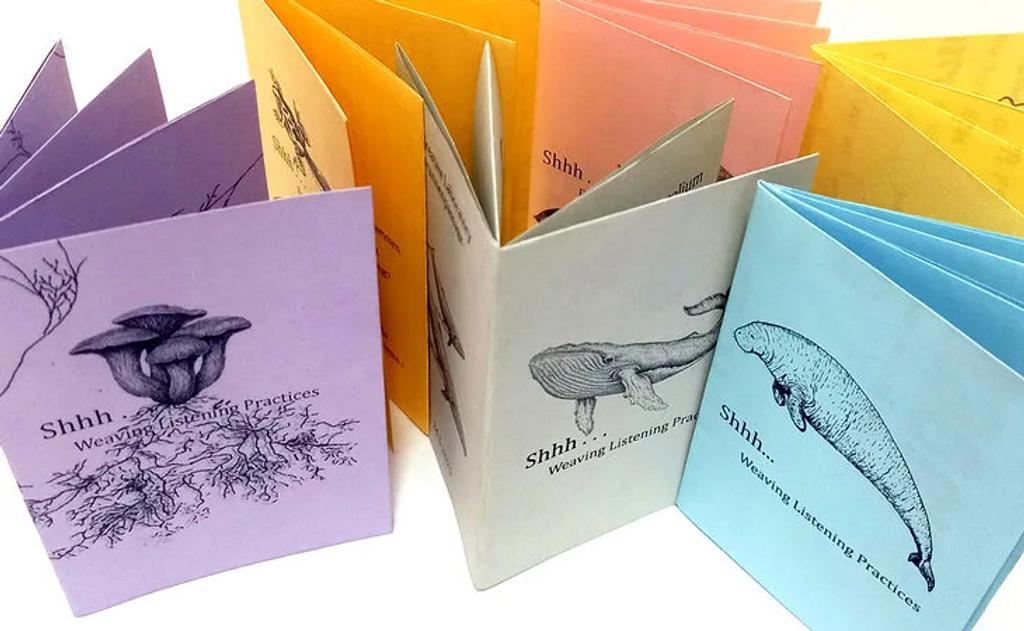 Zwischen November 2024 und Mai 2025 kam in der Brunnenpassage eine Gruppe von Künstler*innen, Aktivist*innen und Zuhörenden zusammen, um Zuhören als körper-basierte und kollektive Praxis zu erforschen – durch Bewegung, Klang, spekulatives Erzählen, Stille, Erinnerung und Widerstand. Von ko-kreativen Shhh… Workshops bis zur offenen Praxis beim StraßenKunstFest 2025 entstanden gemeinsame Rituale und Methoden – die Myzel-Bewegungsmeditation, Soundscapes, spekulative Geschichten, Fanzines als Anleitung und Dokumentation zugleich. Dieser verflochtene Prozess wird nun in der Vitrina erfahrbar und lädt ein zum Verweilen, Eintauchen und vertieften Zuhören.