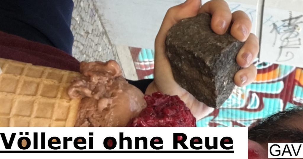 Gierig greifen wir in den Wörtertopf, werfen Texte in Pfannen, Buchstaben auf den Grill, braten, sautieren, dämpfen, schlagen uns den Wanst voll, bis wir nicht mehr können. Nur damit wir uns mit Pfauenfedern dort kitzeln können, wo die gutturalen Laute unserer Gedichte geformt werden. So schaffen wir Platz für den nächsten literarischen Gang mit Zutatenlisten, Rezepten und Anleitungen. Acht Personen decken eine Tafel und sitzen nebeneinander, essend, lesend, völlernd, dichtend, verdauend, musizierend. Sie ergötzen sich an den Freuden einer Todsünde mit Vorspeisen, Suppe, erstem Gang, zweitem, dritten, vierten, dann: Dessert, Dessert, Dessert!!
