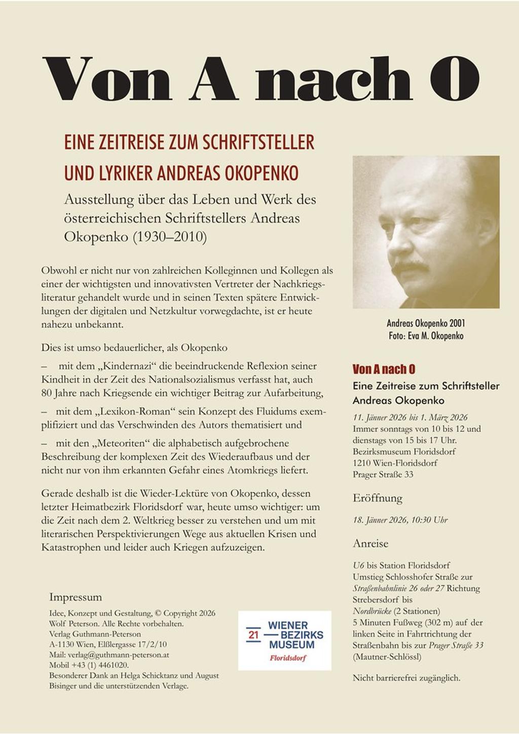 Die Ausstellung von Wolf Peterson über Andreas Okopenko im Bezirksmuseum Floridsdorf ist eine Einführung in das Leben und Werk dieses österreichischen Schriftstellers (1930–2010) für Leserinnen und Leser ohne Vorkenntnisse. Obwohl er als einer der wichtigsten und innovativsten Vertreter der Nachkriegsliteratur gilt, die Zeit des Nationalsozialismus aufgearbeitet und spätere Entwicklungen der digitalen und Netzkultur vorweggenommen hat, ist er heute nahezu unbekannt.