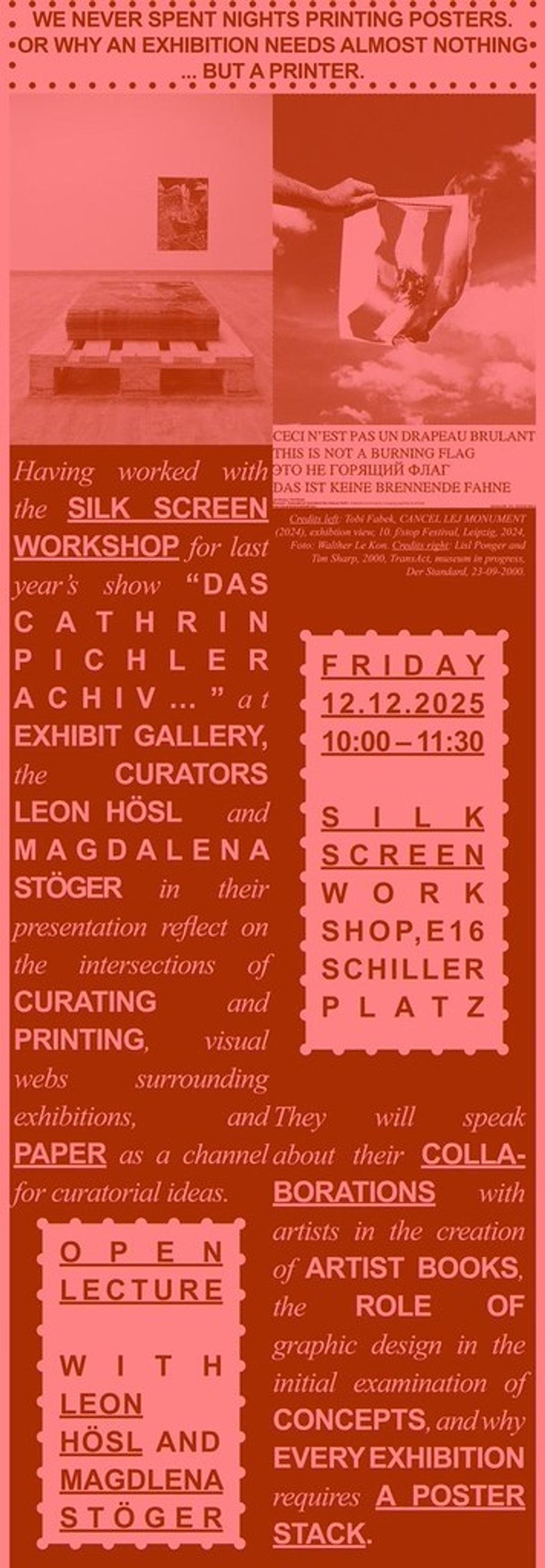 Nachdem die Kurator_innen Leon Hösl und Magdalena Stöger auf Grund der letztjährigen Ausstellung Das Cathrin Pichler Archiv … in der Exhibit Galerie mit der Siebdruckwerkstatt der Akademie zusammengearbeitet hatten, reflektieren sie in ihrem Vortrag über die Schnittstellen zwischen Kuratieren und Drucken, visuelle Netzwerke rund um Ausstellungen und Papier als Kanal für kuratorische Ideen.