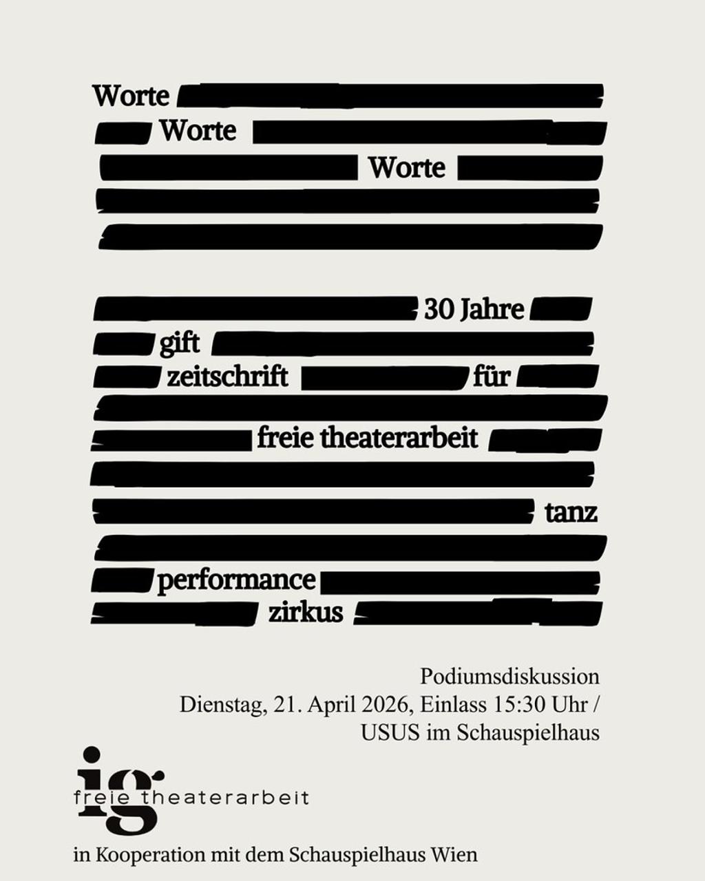 Seit Mitte der Neunzigerjahre ist die gift fester Bestandteil der Interessengemeinschaft Freie Theaterarbeit. Und schon seit ihrer Gründung hat sie sich als Sprachrohr derer erwiesen, die nicht nur an der Analyse von Kulturstrategien, sondern auch an den Bühnensprachen und Persönlichkeiten interessiert sind, welche die Freie Szene prägen. Aus Anlass des 30-jährigen Bestehens lädt die IGFT zu einem feierlichen Austausch, bei dem Stimmen aus dem Kulturjournalismus, der Tanzwissenschaft und der Dramatik aufeinandertreffen, um die Bedeutung und Zukunft eines solchen Mediums von „Worten, Worten, Worten“ für die Freie Szene zu diskutieren.